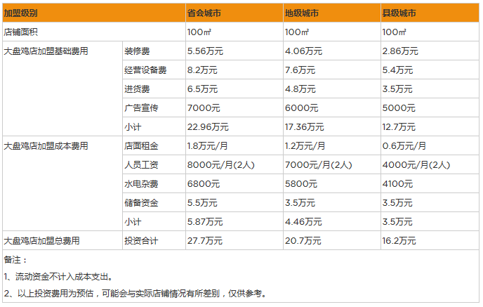 開家大盤雞店投資一般需要多少錢?100㎡投資16萬,詳情數據分析