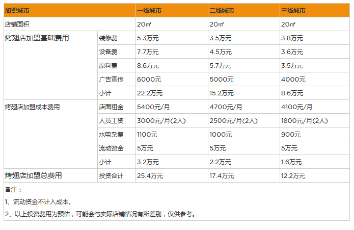 烤翅店加盟的費用可以說門檻很低,加盟費為1.98萬元,而且此費用包括了運營咨詢費、技術轉讓費、品牌使用費、人員培訓費等等。另外還有每年度2000元的運營服務費,此服務費既可以按季度繳納,也可以按年收取,加盟者可以和烤翅店粉商定。開店加盟所需的費用,要結合自己所在的城市和選擇的建店地址不同,會有較大差異,所以總的加盟費用并不一樣。以三線城市為例,如果是20平米的經營店鋪,大約需要每個月6000元的租金,再加上裝修費,設備費用,還有材料費用,以及水電和員工工資,原材料費等等,開一家烤翅店的總體加盟費用,大約為12萬元左右。