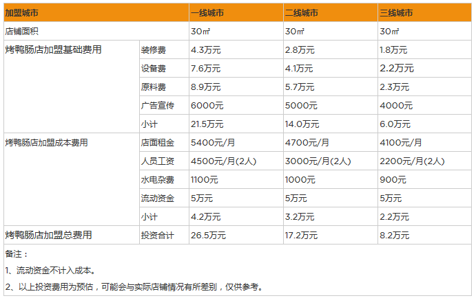 開家烤鴨腸店投資大概多少錢?30㎡成本預算花費8萬元