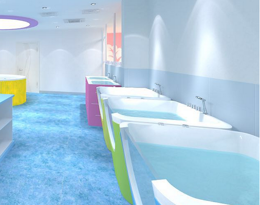 嬰兒游泳館面積大小、館內布局根據實際情況均有所不同,以嬰兒游泳間面積為80㎡舉例,一般80㎡游泳間可配置的嬰兒游泳館設備為:兒童游泳池1臺、嬰兒游泳池3臺、嬰兒洗澡盆2臺、兒童洗澡盆1臺、嬰兒游泳館專用快速熱水設備1臺;
