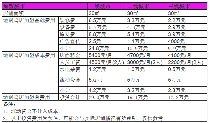 地鍋雞人們喜愛的食物。開個家很有前景。路過地鍋雞店的朋友不難發(fā)現,店內總是座無虛席,人山人海。利潤當然可觀。在當地開一家地鍋雞賺錢嗎?小編采訪了杭州一家加盟店的工作人員,了解到這家地鍋雞店的日客流量可以達到100人,平均消費30元,日營業(yè)額3000元,月營業(yè)額9萬元。公司綜合毛利率46%,月毛利4.14萬元。扣除每月經營成本后,包括店面租金5400元(45平方米)、員工工資5000元(2人)、水電雜費1000元。一個月的凈利潤可以達到3萬元左右。一年內,加盟商至少可以實現36萬元的凈利潤。這樣的利潤在同一規(guī)模的餐廳中非常令人羨慕,而且利潤率還是非常大的。