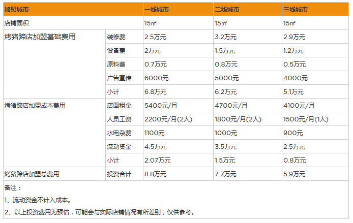 地級城市:投資15㎡的烤豬蹄店需要投入前期原材料6000元、人工成本1800元/月、設(shè)備費用1.5萬元、流動資金2萬元等等,開店的總費用是7.72萬元。