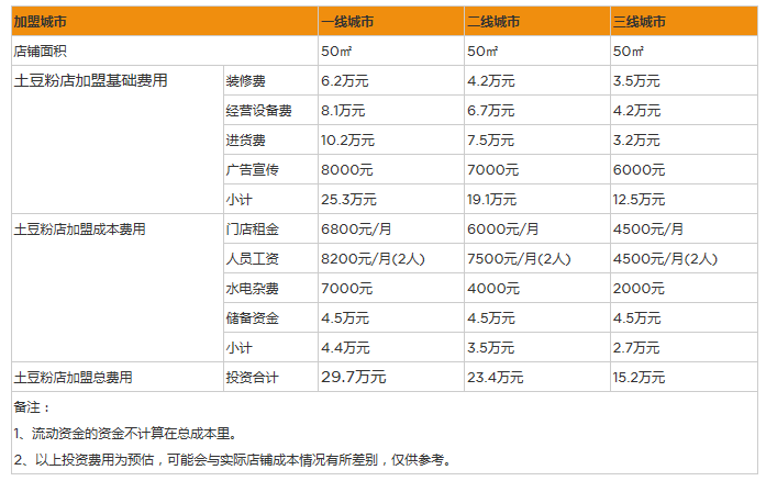 開土豆粉店好是選擇加盟連鎖這種經營方式,因為現代人更加傾向于到一些知名的餐飲連鎖店就餐,加盟發展多年并且有著很好口碑的土豆粉連鎖品牌,可以使創業過程更順暢。而想要走這條創業捷徑,必然需要投入一定的資金,想要成為知名土豆粉連鎖品牌的加盟商,必須要符合其加盟條件的要求,并且繳納一定的加盟金。而正規的餐飲連鎖品牌會制定嚴格的加盟費用收取標準,就拿開土豆粉店來說,假如開一家50平米左右的土豆粉加盟店,需要投入包括品牌商標使用費和管理費在內的加盟費用1萬元到3萬元之間,此外,裝修費、房租費、設備費、原料費、廣告費等方面的資金投入至少需要12萬元,因此,想順利的開一家受到當地消費者認可的土豆粉店,智慧之選至少需要準備15萬元以上的資金。