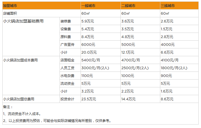 開個小火鍋店的成本多少?再算上宣傳費、流動資金、水電等費用,開個小火鍋店至少需要20萬元左右。