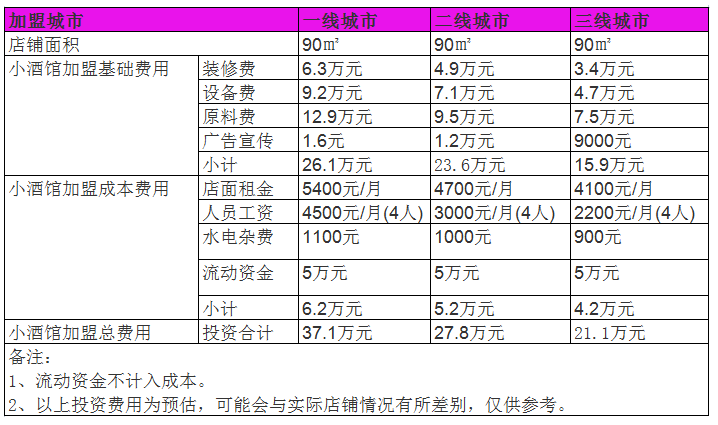 假設(shè)在一家地級城市開設(shè)一家小酒館的話,需要有充足的酒產(chǎn)品,桌椅板房等擺放空間,加盟商需要準(zhǔn)備一個90平方米大小的店鋪,按照地級城市的房價計算,每月需要支付1.67萬元的房租費用,酒館的裝修需要符合其經(jīng)營理念和營造良好的氛圍,門店需要進行精致的裝修,大約需要花費4.5萬元。